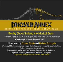 Boston’s premiere music ensemble Dinosaur Annex presents brand new works by MIT Music and Theater Arts composer Charles Shadle, Italian composer/researcher Michele Zaccagnini, and MIT student composers. Hear MIT neuroscientist Joshua McDermott tell us about his recent trail-blazing work that discovered brain pathways that respond just to music.