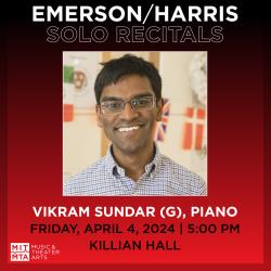 Pianist Vikram Sundar is a fourth-year graduate student in the Computational and Systems Biology program at MIT, working with Prof. Kevin Esvelt on machine learning for protein design. He has played piano since the age of 5 and currently studies with Eileen Huang as an Emerson/Harris Scholar. Previously, he took lessons from Erna Gulabyan in California. He prefers Romantic repertoire, and has previously learned and performed virtuosic works by composers including Beethoven, Chopin, Liszt, and Rachmaninoff. At MIT, he has participated in the Chamber Music Society for 3 years, performing piano trios by Brahms and Tchaikovsky. This is his third year in the Emerson/Harris Scholarship and his second solo recital; last year, he performed Mussorgsky's Pictures at an Exhibition and Prokofiev's Romeo and Juliet.
